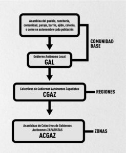 Third. – Next, the Assemblies of Collectives of ZAPATISTA Autonomous Governments, ACZAG [ACGAZ for its acronym in Spanish]. Which are what were previously known as zones. But they have no authority, and depend on the CGAZ. And the CGAZ depend on the GAL. The ACGAZ convenes and presides over zone assemblies, when necessary according to the requests of GAL and CGAZ. They are based in the caracoles, but move between regions. In other words, they are mobile, according to the towns demands for attention.